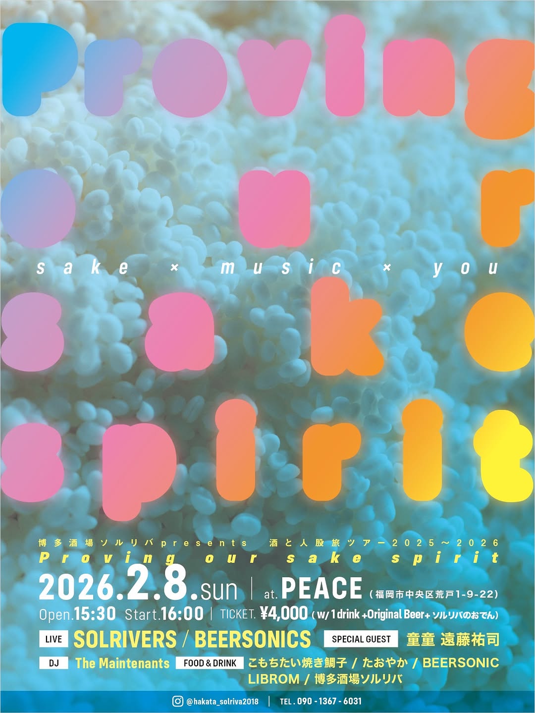 Peace 1 Chome-9-22 Arato, Fukuoka, Fukuoka, JPHakata Sakaba Solriva presents 'Proving Our Sake Spirit,' a lively celebration of sake, music, and food! Join the party on February 8, 2026, at Peace in Fukuoka for a fun-filled...