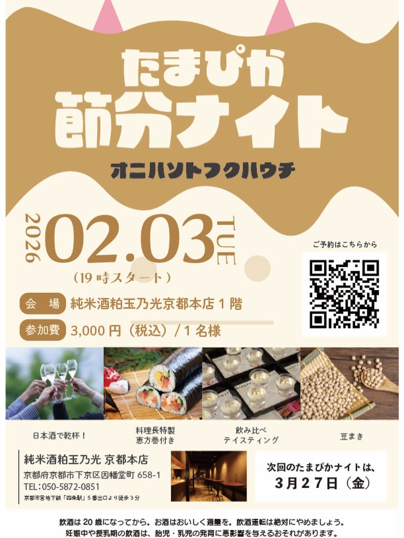 Junmai Sake Kashiwa Tamano Hikari Kyoto Main Store 658-1 Inabadocho, Kyoto, Kyoto, JPCelebrate Setsubun at Tamapika Setsubun Night featuring a sake toast, special chef-made ehomaki sushi rolls, sake tasting, and a traditional bean-throwing ceremony. Held at the Junmai Sake Kashiwa Tamano Hikari...