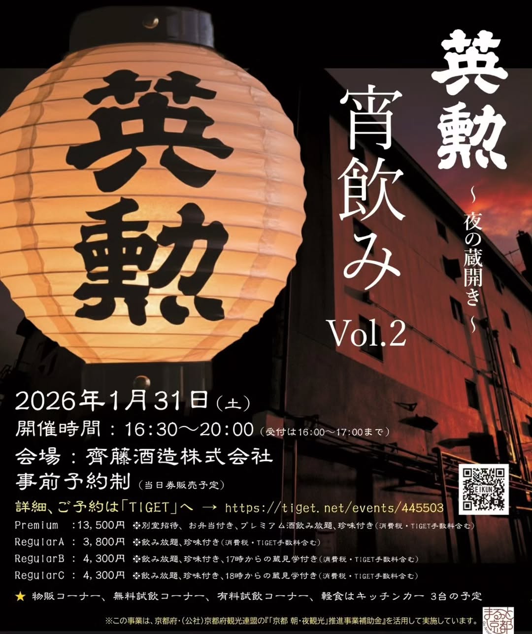 Saito Shuzo Co., Ltd. Japan, Kyoto, Kyoto, JPDiscover Eikun's sake at their special night brewery open house, Vol.2! Enjoy exclusive sake tastings, brewery tours, a premium tasting experience, and sample rare snacks. There will be sake for...