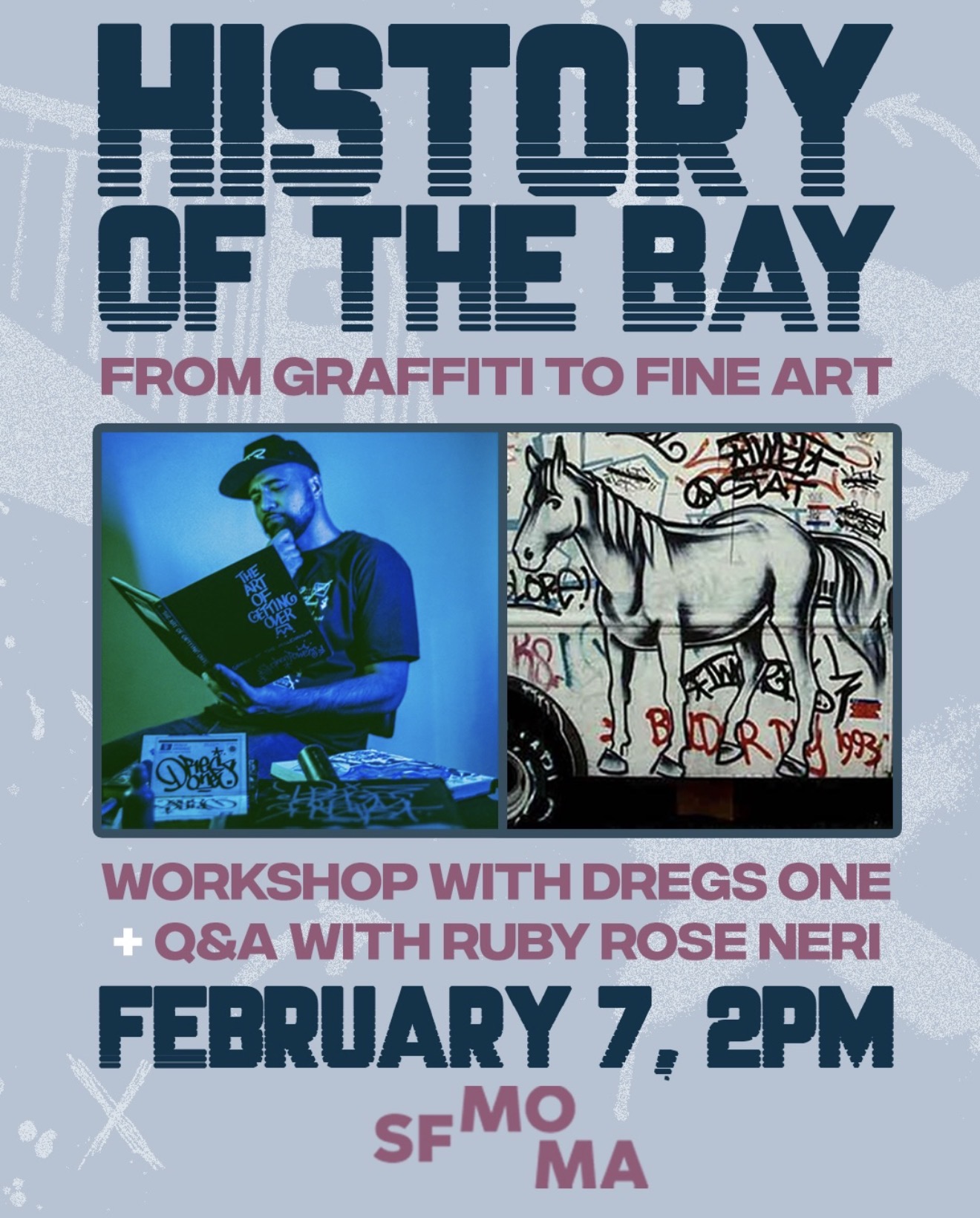 SFMOMA 151 3rd Street, San Francisco, CA, USExplore the evolution of graffiti to fine art at SFMOMA in this engaging workshop hosted by Dregs One, featuring a Q&A with Ruby Rose Neri. This all-ages event is free...