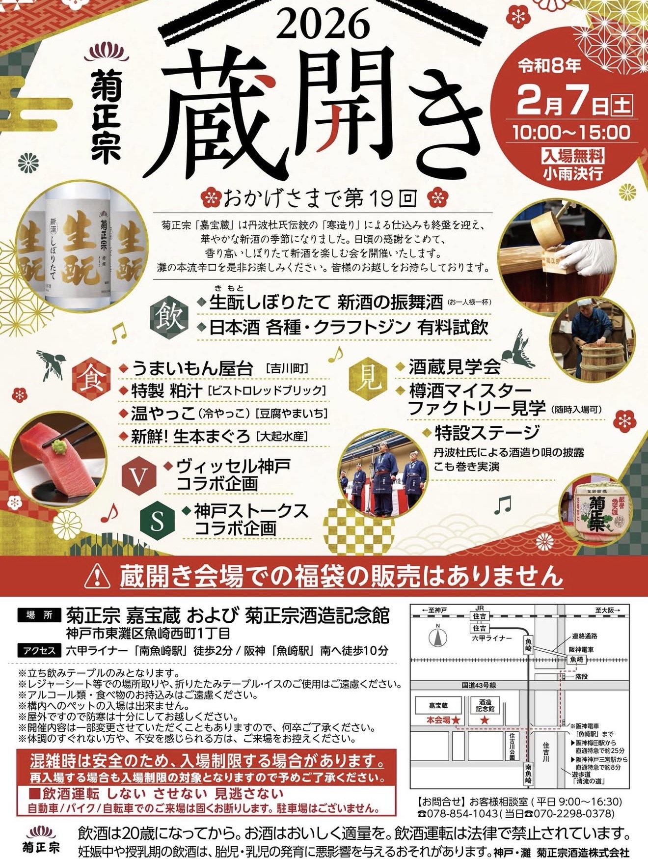 Kiku-Masamune Sake Brewery and Kiku-Masamune Sake Brewery Memorial Hall 1 Chome-9-1 Uozaki Nishimachi, Kobe, Hyogo, JPCelebrate the 19th annual Kura Biraki Sake Festival at Kiku-Masamune Sake Brewery in Kobe! Enjoy tastings of freshly pressed sake straight from the brewery, plus a selection of Japanese sakes...
