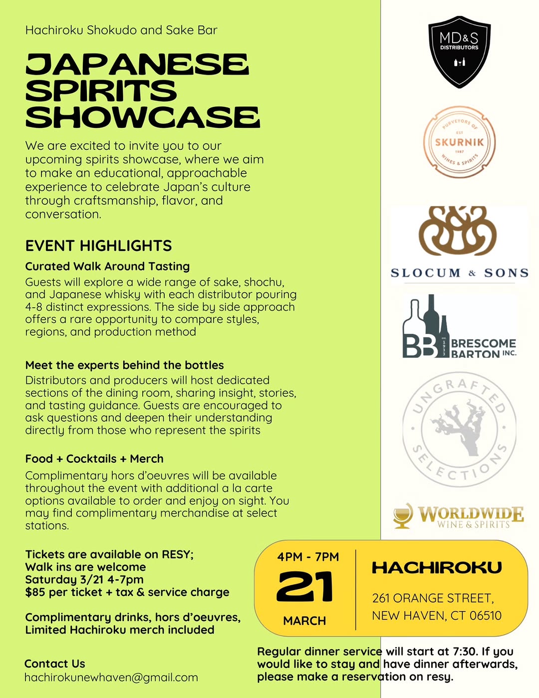 Mar 21 Japanese Spirits Showcase 4:00 pm - 7:00 pm Hachiroku 261 Orange Street, New Haven Event Details Get Directions