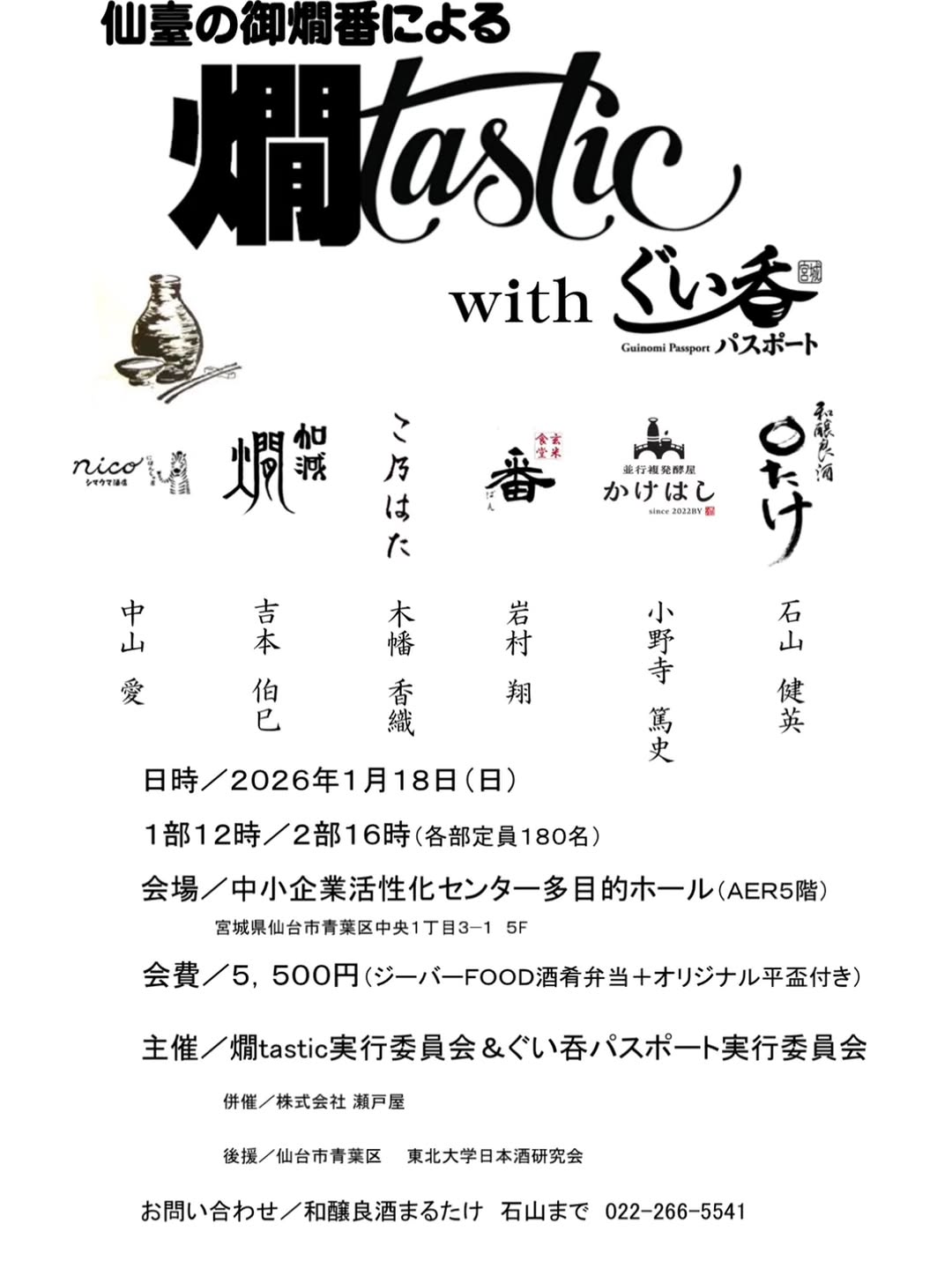 Jan 18 12:00 pm - 3:00 pm Kantastic with Guinomi Passport 中小企業活性化センター多目的ホール (AER5階) Japan, 〒980-0021 Miyagi, Sendai, Aoba Ward, Central, 1 Chome−3−1 5F, 仙台市 Event Details Get Directions