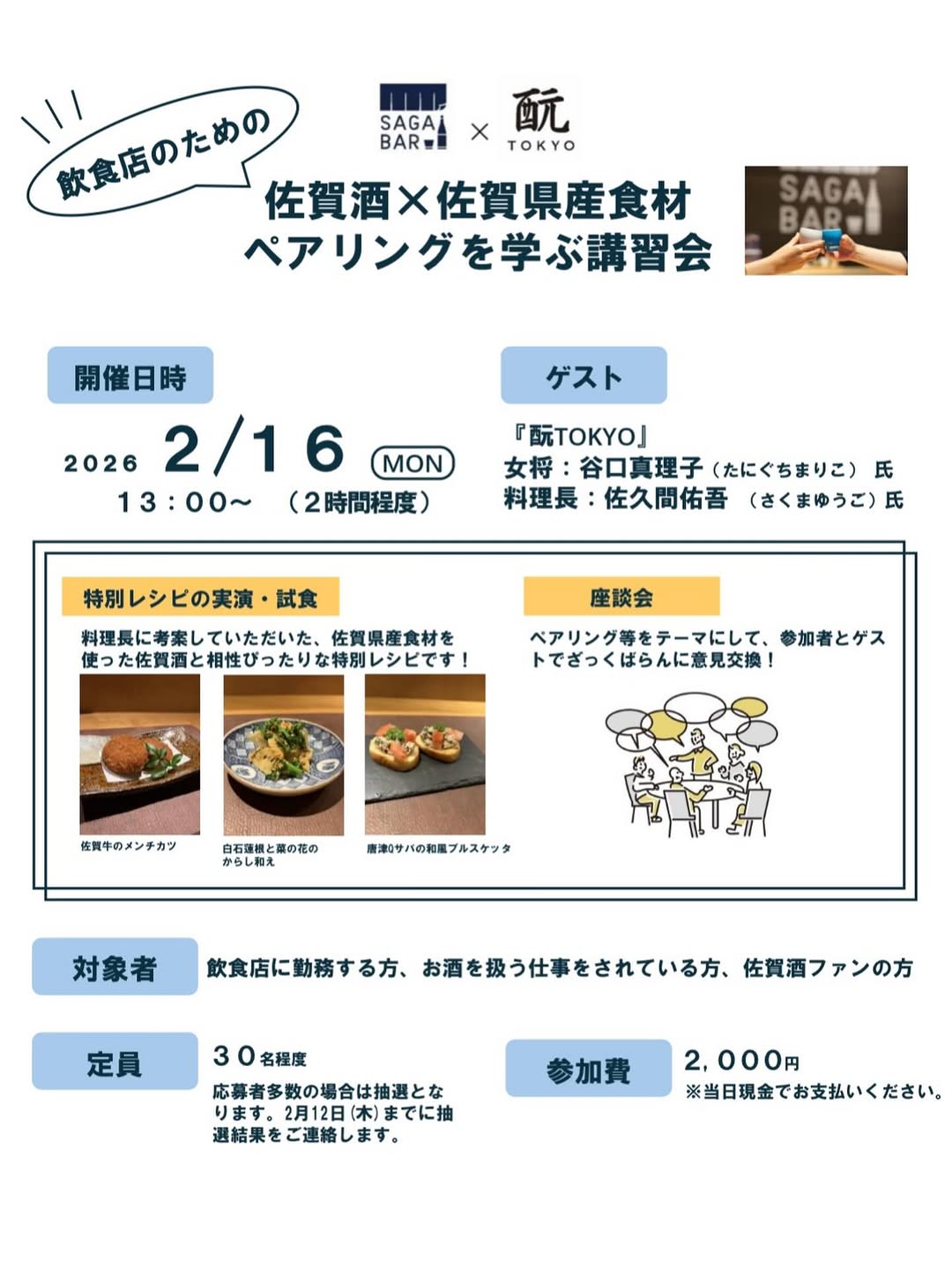 Saga Sake x Saga Ingredients Pairing Seminar for Restaurants Feb 16 Saga Sake x Saga Ingredients Pairing Seminar for Restaurants 1:00 pm - 3:00 pm ¥2000 JPY