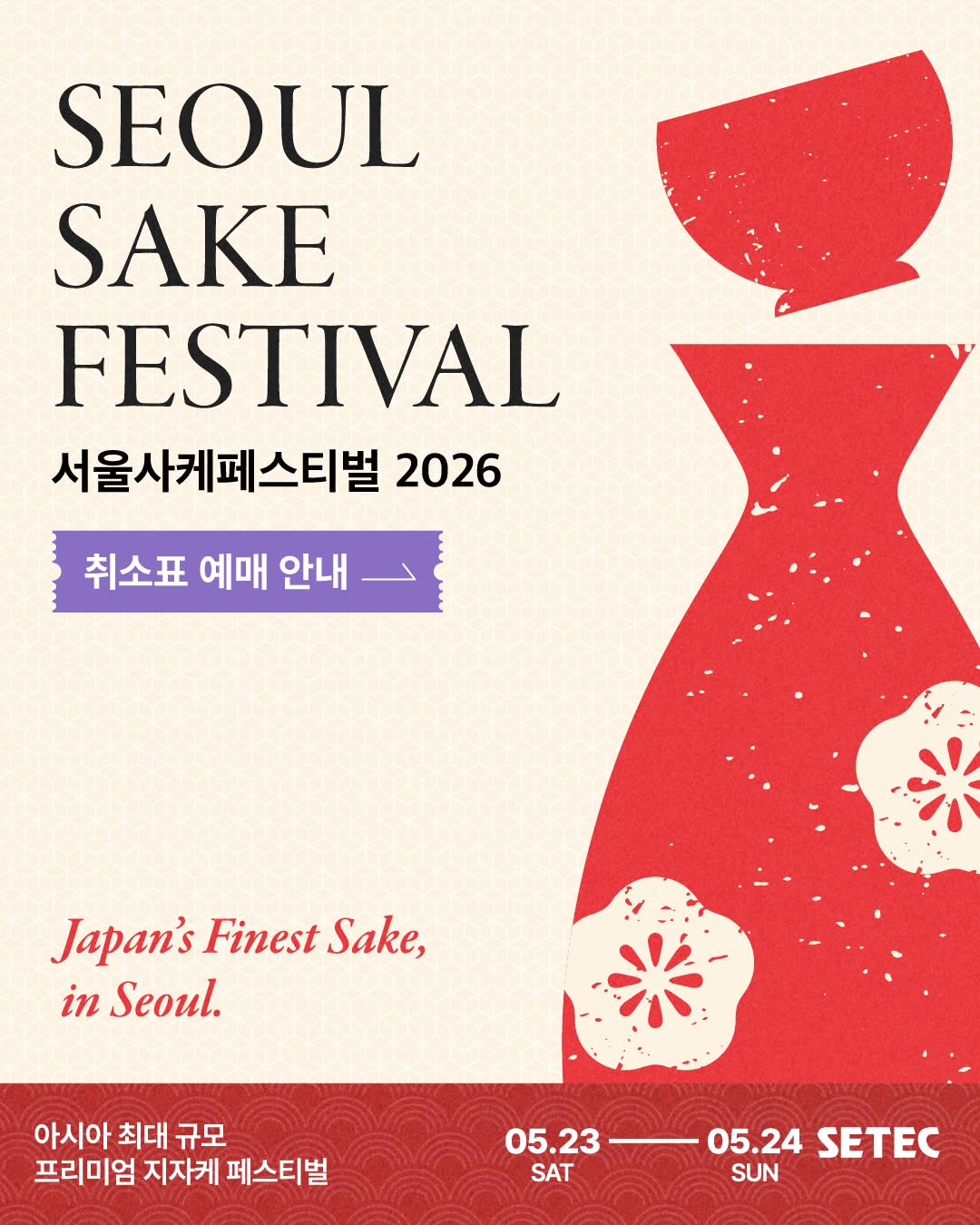 Seoul Sake Festival 2026 (Day 1 of 2) May 23 Seoul Sake Festival 2026 (Day 1 of 2) 11:00 am - 6:00 pm